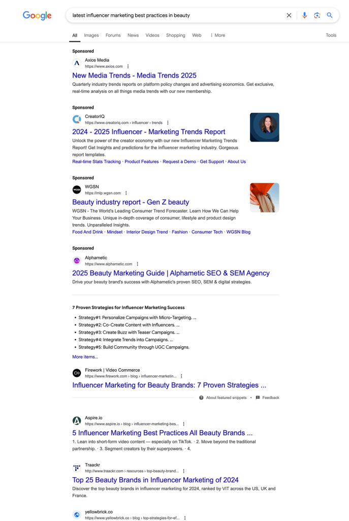 - Google: Searching for “influencer marketing best practices in beauty” returns a bunch of sponsored filled with superficial content.